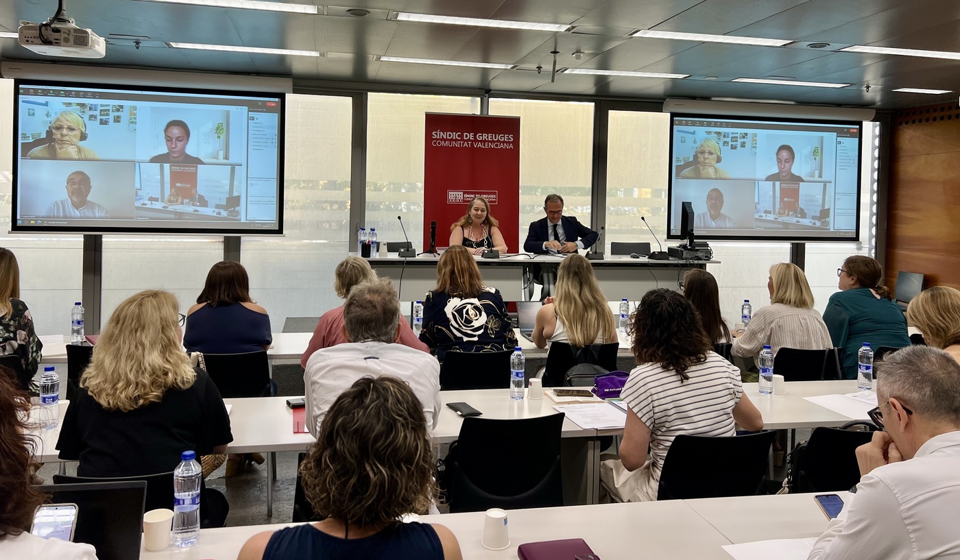 El encuentro ha contado con la participación de Concepción Bru, adjunta primera del Síndic; Carlos Castillo, adjunto segundo; Rebeca Lino, vicedecana del ICAV; Trinidad Piquer, diputada 11.ª de la Junta de Gobierno del ICAV; y Alicia Pradells , diputada del Ilustre Colegio de Abogados de Alicante, además de otros representantes de la entidad, miembros del Observatorio y de la Comisión Ejecutiva de la Sección de Infancia y Adolescencia del ICAV.